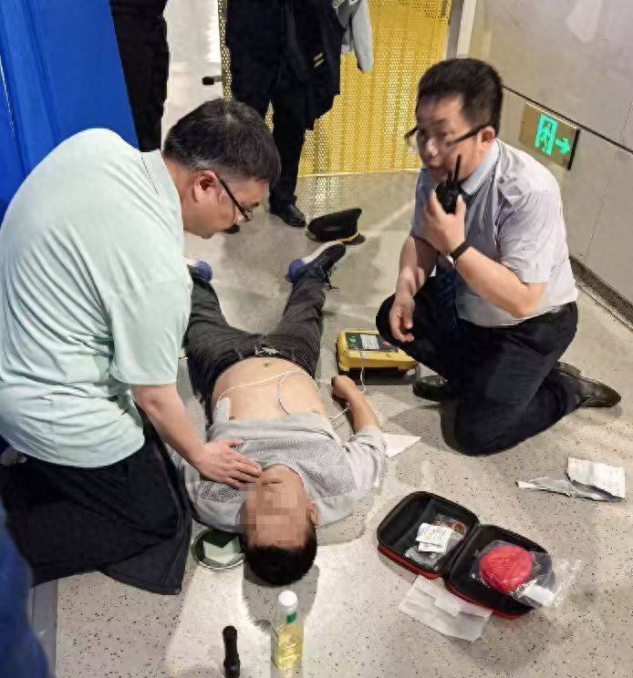 施救工作随即展开,一场与死神赛跑的生死接力正式上演。郑健、叶森森与热心医生轮番上阵,双膝跪地为乘客实施标准心肺复苏:按压、通气、计数,动作规范有力,汗水很快浸透了他们的制服,膝盖在站台地面上磨得通红,却没有一人停下动作。与此同时,另一名工作人员迅速取来车站配备的AED(自动体外除颤仪),严格遵循设备语音指引,实施电击除颤等流程,先后为乘客实施4次体外除颤,为恢复心跳赢得关键机会。