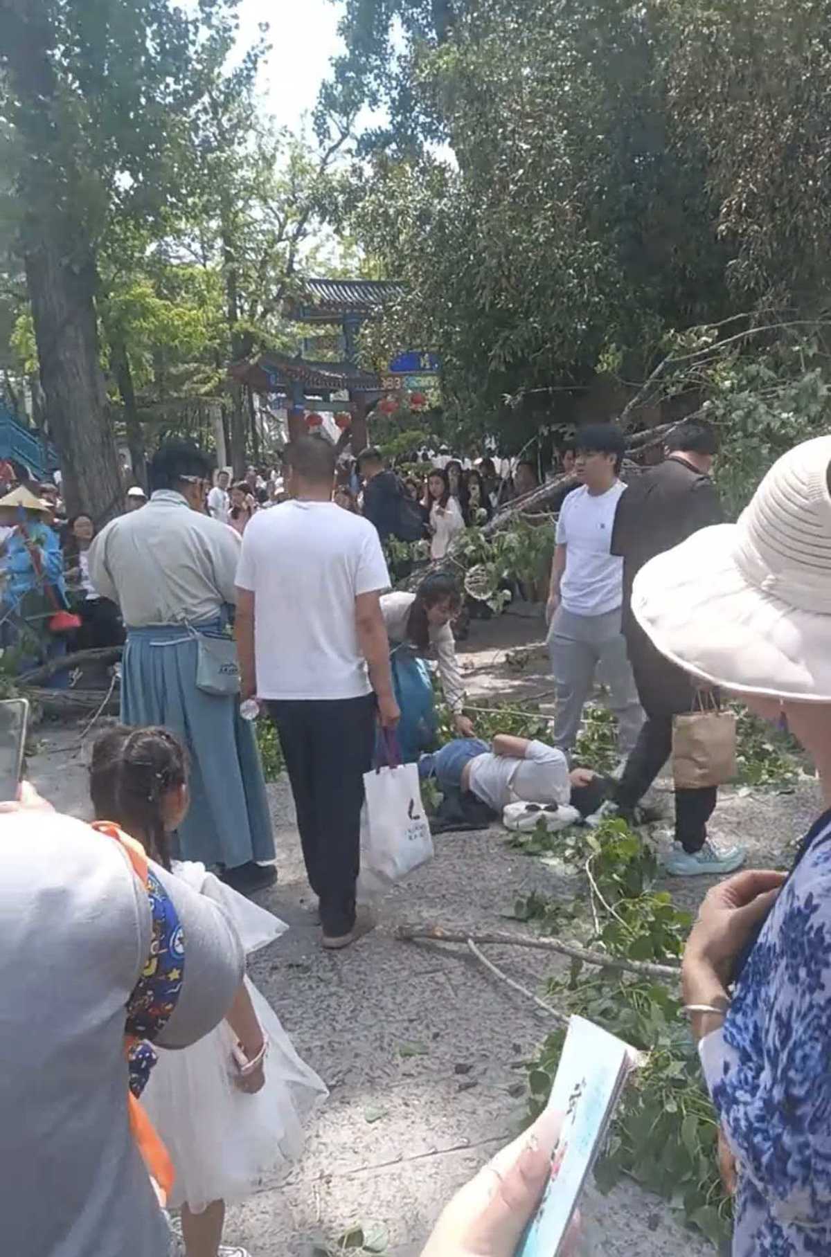 4月18日下午,多位网友发视频称,开封万岁山景区树干断落,有3名游客被砸躺地。19日上午,客服人员表示,景区目前正常开放,伤情有待官方通报。