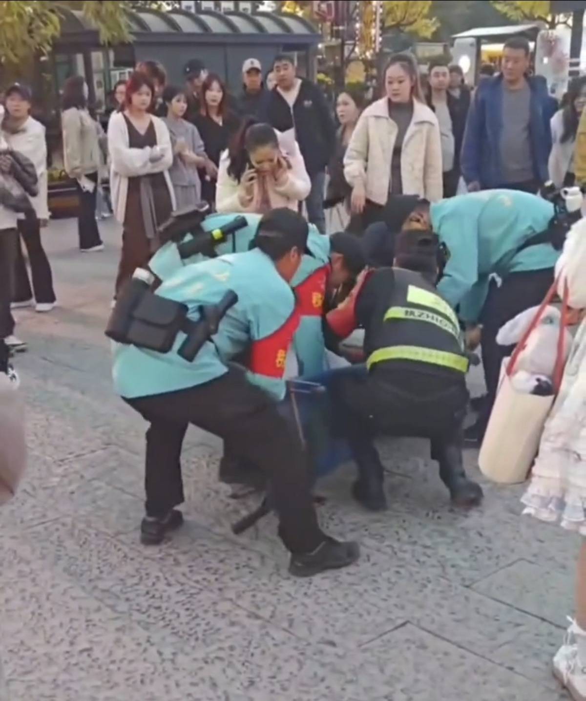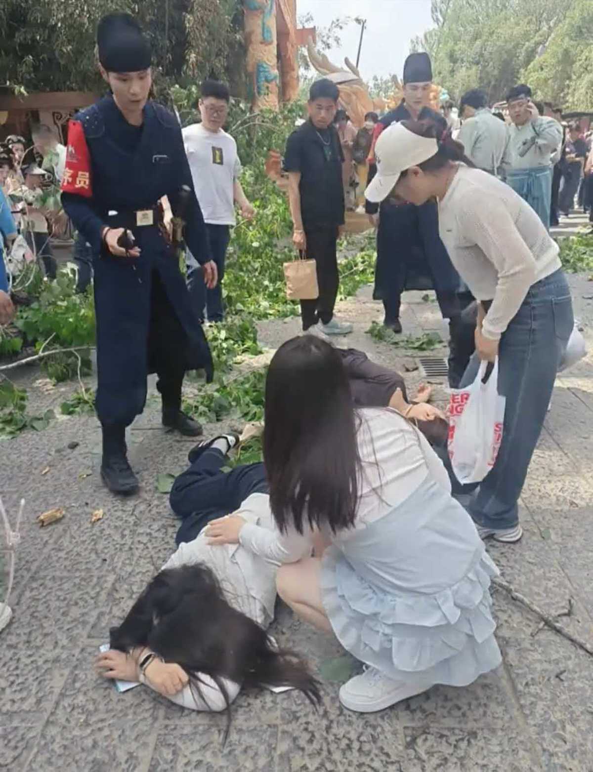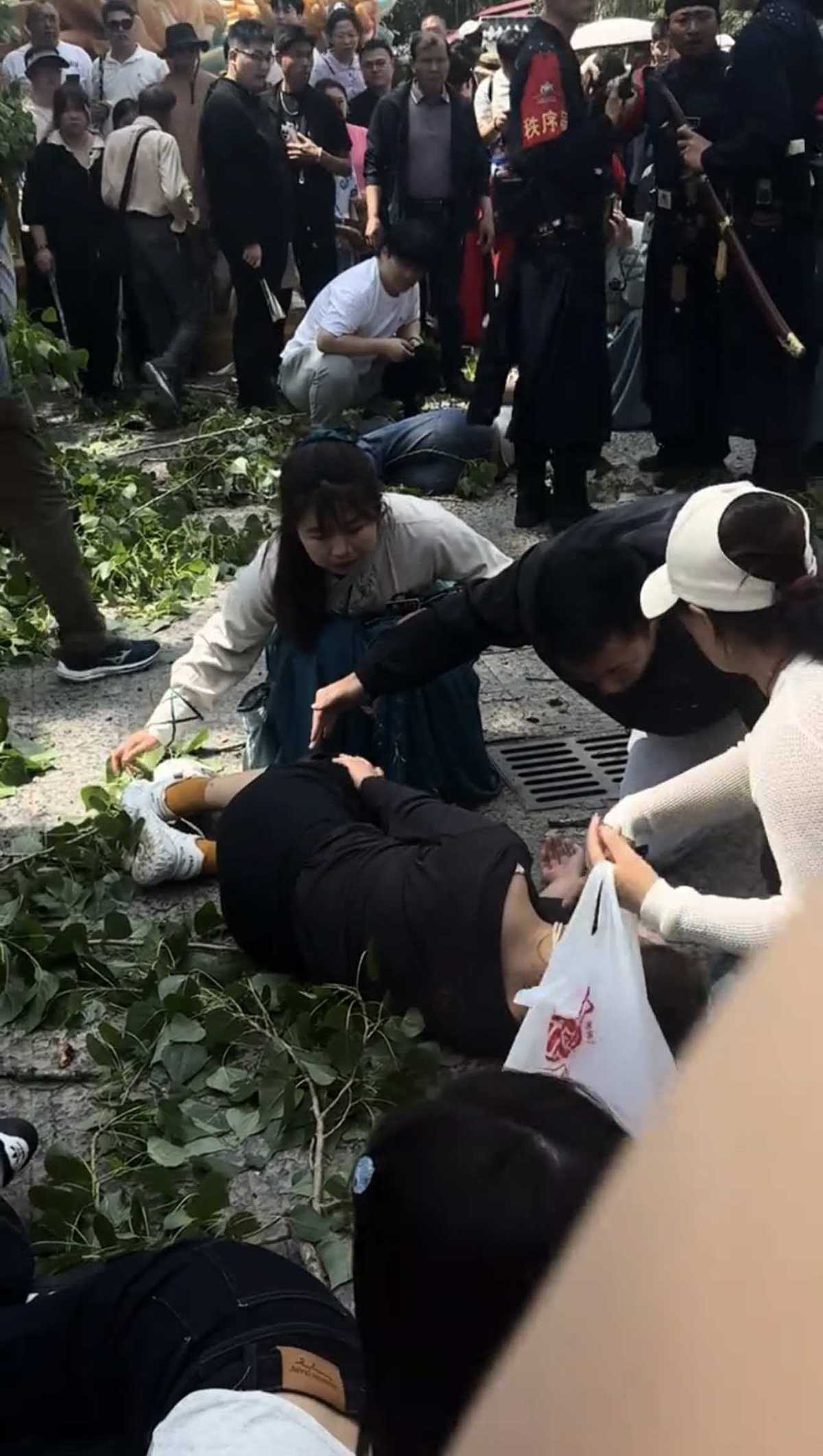 据现场游客介绍,18日中午12点半左右,在万岁山景区中门水浒里,她坐在厕所外面树荫底下等人,突然听见一阵“吱吱扭扭”的声音,紧接着树上碗口粗的树干掉下来了,她急忙跑开。有人被砸倒在地后,周围的工作人员疏散人群,有热心游客帮忙施救,还有群众帮忙拨打急救电话,没多久景区领导和警察都到了。大概15分钟,来了3辆救护车,把伤者送往了医院。