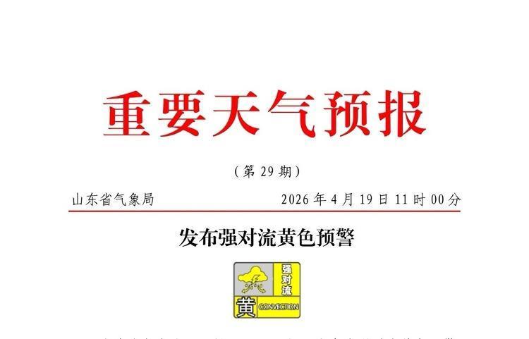 山东省气象台于4月19日11时发布强对流黄色预警:受高空槽影响,预计19日傍晚到夜间我省内陆地区和各责任海区自西向东将出现一次强对流天气过程,并伴有雷电和7~9级雷雨阵风。其中,滨州、东营、德州、聊城、济南、泰安、菏泽和济宁最大阵风可达10级以上,局部有小冰雹和小时雨量20毫米以上的短时强降水。全省以小雨为主,鲁中和鲁南的部分地区有中雨,累积平均降雨量3~8毫米。